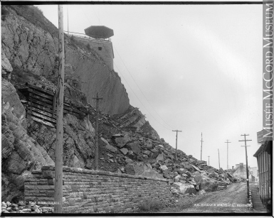 Désastre affreux »: « Entre onze et onze heures et demie ce matin une partie du cap, située devant les magasins du Roi [tout près de l’actuel édifice de la Société des traversiers sur le boulevard Champlain], d’une largeur d’environ deux arpents, s’est éboulée, avec un fracas épouvantable, emportant avec elle le mur des fortifications, sur les maisons qui bordaient la rue Champlain en cet endroit ».(1) On dit qu’une forte pluie tombait au moment de la tragédie, probable cause de l’éboulement, mais aussi du nombre élevé de victimes (on parle au moins de 29 victimes dans les différentes éditions du journal) puisque les gens se trouvaient chez eux. Dans la semaine, les gens vivant à proximité de l’éboulement désertèrent leurs maisons qui furent immédiatement occupées par d’autres habitants de la ville à la recherche d’un toit. Des scènes de bagarres et de désordre furent aperçues entre les différents « occupants » et la Police dut intervenir. Cependant, comme le dit le journal: « C’était là se battre pour le privilège d’être écrasé quelqu’un de ces jours »